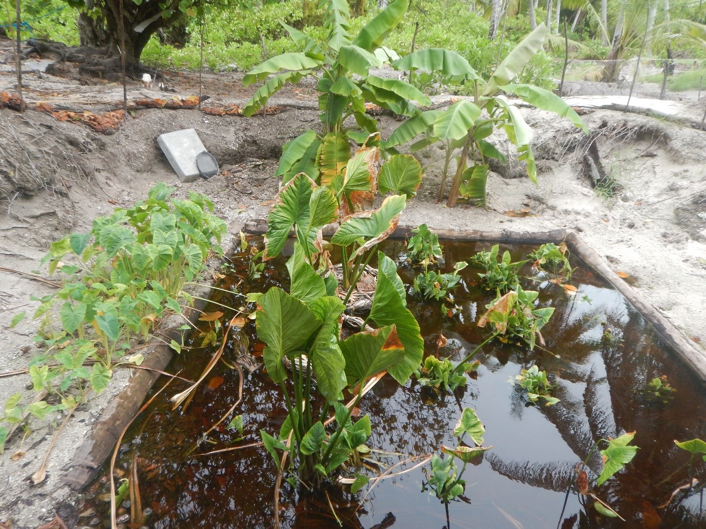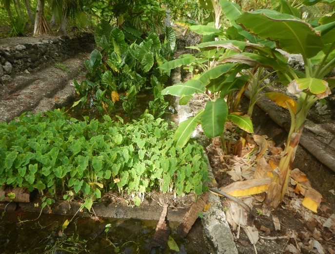 Over three-hundred kind of food crops are successfully grown inside four giant taro pit that have lain fallow for years. The giant taro pit has been remodelled using terracing methods to plant other food crops using a small piece of land. Barenaba Itaia, one of many active farmers whose interests in giant taro cultivation had extended to other food crop planting had remodelled his 4 giant taro pits by planting giant taro and kangkong (Ipomoea aquatica) down at the water level, taro plants on a muddy bank. On the first terrace he plants Ceylon spinach, the second terrace up is covered with bananas and papayas, followed by kumara patch and on the ground level you could find drumsticks, breadfruits, chaya (Cnidoscolus aconitifolius), iamaii, iaroo (Pseuderanthemum whartonianum), seeded and non-seeded breadfruit trees.